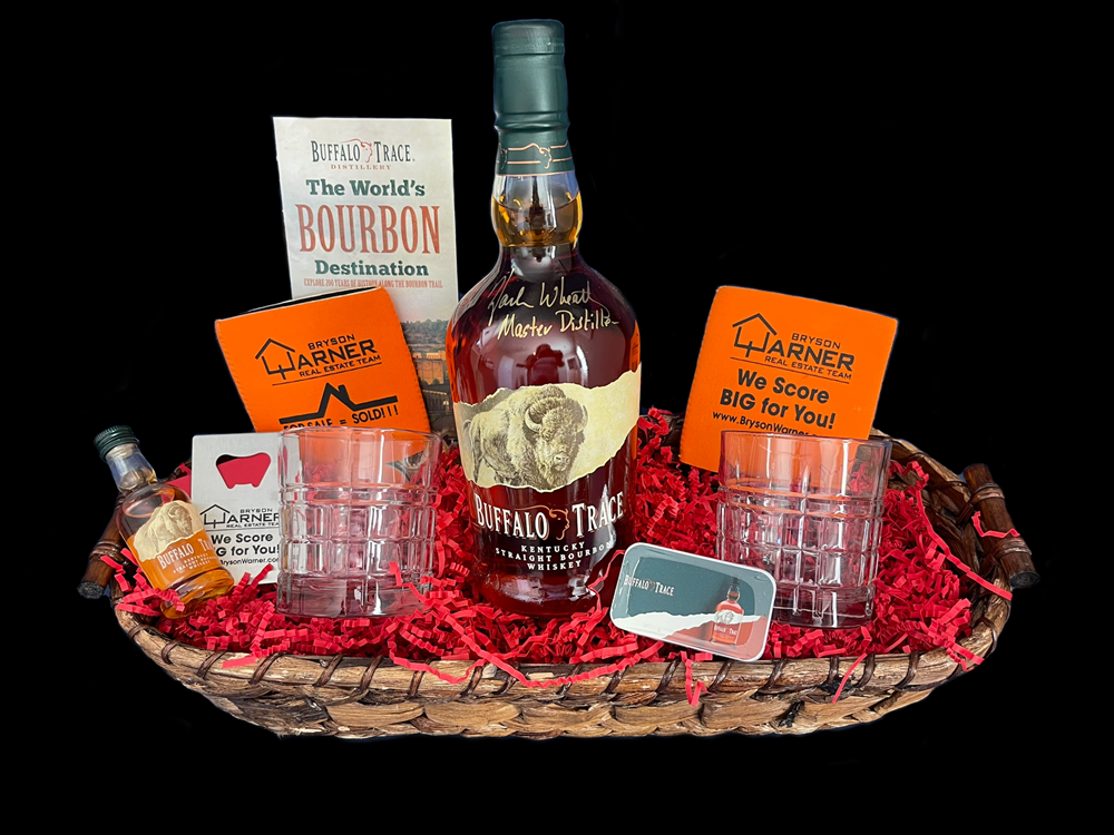 This basket graciously donated by the Bryson Warner Realty Group includes a bottle of Buffalo Trace Bourbon signed by Buffalo Trace Master Distiller Harlen Wheatley. It also includes: 2 bourbon glasses 2 Koozie's 1 Bottle Opener 1 Tin of Buffalo Trace Mints 1 Airplane Size Bottle of Buffalo Trace