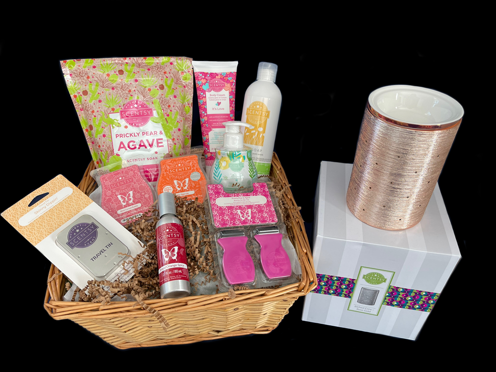 This basket includes the following: 1 Scentsy Rose Gold Warmer 1 Scentsy Soak Bath Salt - Prickly Pear & Agave 1 Scentsy Travel Tin - Skinny Dippin' 2 Scentsy Car Bar Clips - Prickly Pear & Agave 1 Scentsy Room Spray - Blood Orange Spice 1 Scentsy Hand Wash - 1 Scentsy Body Cream - It's Love 1 Scentsy Melting Wax - Hey Tiger Lily 1 Scentsy Melting Wax - Black Current Bubbly 1 Scentsy Dish Soap -