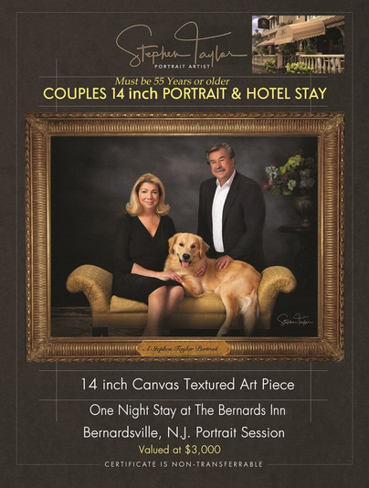 World-renowned Photographic Portrait Artist, Stephen Taylor of Bernardsville, will create a 14-inch textured fine art piece portrait of a Legacy couple, in his Bernardsville, NJ studio. Also included, is a one night stay at The Four Diamond Bernards Inn the evening prior to your portrait session. Hotel: Escape into the stunning New Jersey Somerset Hills countryside where you'll discover The Bernards Inn nestled in the quaint hamlet of Bernardsville. Step back in time to a bygone era of understated elegance, supreme luxury, and unparalleled privacy 30 minutes from Manhattan and 90 minutes from Center City Philadelphia. A $3000 Value. The Legacy Couple must be 55 years or older. Not transferable. It must be used by the winner. Hotel must be used in conjunction with the portrait session.