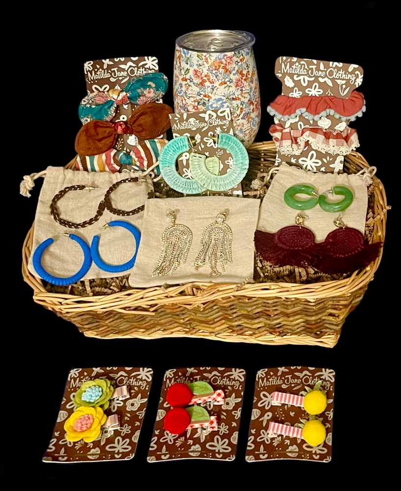 This basket includes some fun things from the Matilda Jane Jewlery Collection including: 1 Pair Good Hart Destination Hoop Earrings 1 Pair Wanderlust Maroon Fan Earrings 1 Pair Pretty Palace Teal Earrings 1 Pair Under the Tree Rhinestone Waterfall Earrings 1 Pair Under the Tree Jade Hoop Earrings 1 Set Fruit Smoothies Clips 1 Set Pom Pom Cherry Clips 1 Set Enchanted Garden Flower Clips 1 Matilda Jane White Floral Heart Travel Thermal Wine Glass 1 Matilda Jane Kassidy Blair Girls Scrunchie Set 1 Matilda Jane Just Imagine Girls Fabric Knot Hairclips (Set of 3)