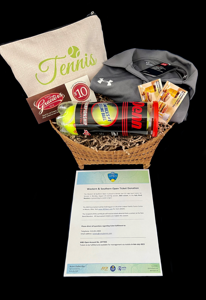 This basket that any tennis lover will adore, includes the following items: 2 Tickets the Western & Southern Open Tennis Tournament for Monday August 14th's evening session. 1 Tennis Canvas Bag 1 Pack of 3 Penn Tennis Balls 1 XL Under Armor Women's Short Sleeved Tennis Polo Size Large 1 $10 Gift Certificate to Grater's Ice Cream to enjoy after the match 2 McDonald's Combo Meal Vouchers to enjoy after the match.
