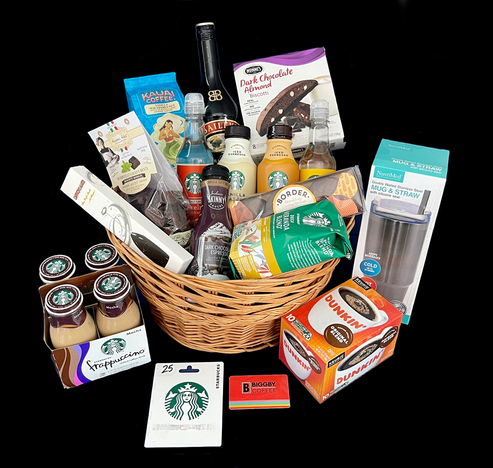 This basket sponsored by the Ryle Alto Saxaphone Section has everything the Coffee Enthusiast needs. It Includes the following: 1 Bottle of Baily's Irish Cream 1 Box Nonni's Dark Chocolate Almond Biscotti 1 Bag of Ground Kauai Vanilla Macadamia Nut Coffee 1 Bag of Ground Starbucks Decaf Veranda Blend 1 Bottle of Jordan's Skinny Sauces Dark Chocolate Espresso Coffee Drizzle 1 Box of Border's Beautifully Crafted Biscuits 1 Bottle of Starbucks Iced Espresso Vanilla Latte 1 Bottle of Starbucks Iced Espresso Caramel Macchiato 1 Bottle of Starbucks Syrup Hazelnut 1 Bottle of Starbucks Syrup 1 Bottle of Starbucks Syrup 1 Bag of Nona Ada Chocolate Mint Biscotti 1 Handheld Cappuccino Frother Wand 1 4-pack of Starbucks Frappuccino Mocha 1 NuvoMed Travel Coffee Tumbler 1 Box of Duncan Doughnuts Keurig Pods Original Blend 1 $20 Gift Card to Biggby 1 $25 Gift Card to Starbucks