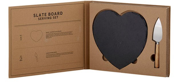 This Wine and Cheese Basket Includes the following: 2 Bottles of Franciscan 2017 Cabernet Sauvignon 2 Clear Wine Glasses 1 Tablesugar Heart Shaped Slate Board- This beautifully hand-crafted slate board provides the perfect place setting for cheeses. 1 Cheese Spade Knife 1 Cheese Tong 1 Cheese Spatula 6 Blackboard Wooden Cheese Label Signs