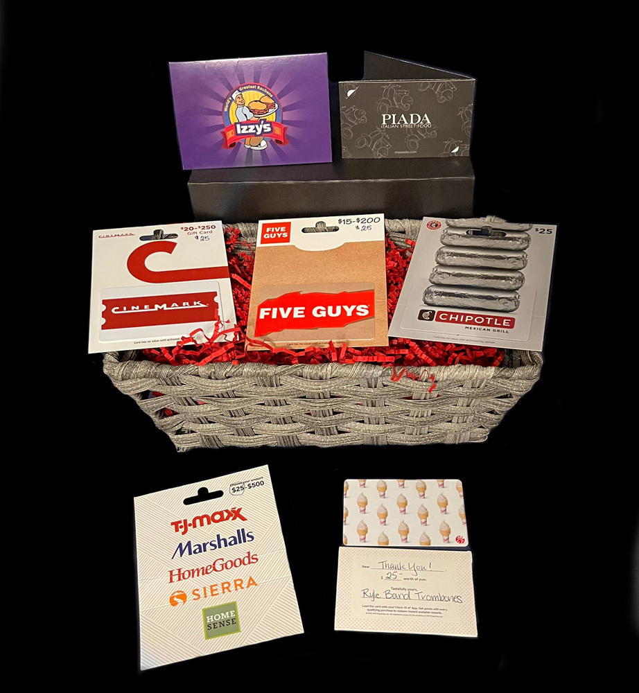This basket sponsored by the Ryle Trombone Section includes all gift cards from Mall Road. It includes the following: $25 Gift Certificate to Izzy's $25 Gift Certificate to Cinemark $25 Gift Certificate to Five Guys $25 Gift Certificate to Chipotle $25 Gift Certificate to TJ Max/Homegoods $25 Gift Certificate to Chick-Fil-A $25 Gift Certificate to Piada