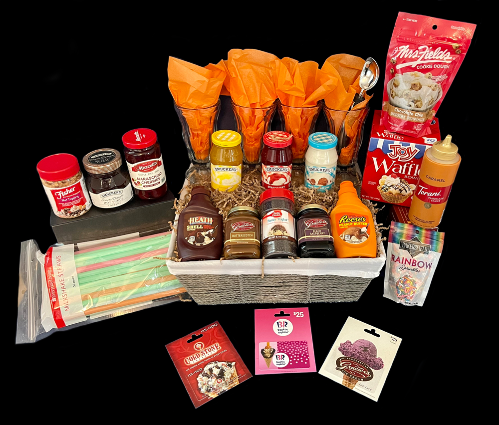 This delicious basket is brought to you by the Ryle Trumpet section and has all you need to make or buy an ice cream treat. It includes the following: 4 Ice Cream Glasses 1 Ice Cream Scoop 1 Jar of Fishers Nut Topping 1 Jar Smucker's Hot Chocolate Topping 1 Jar Mezzetta Maraschino Cherries 1 Jar Smucker's Pineapple Topping 1 Jar Smucker's Strawberry Topping 1 Jar Smucker's Marshmallow Topping 1 Bottle Heath Shell Topping 1 Jar Graeter's Butterscotch Topping 1 Jar Graeter's Black Raspberry Topping 1 Bottle Parlor Perfect Chocolate Sprinkles 1 Bottle Reese's PeanutButter Topping 1 Bag of Milkshake Straws 1 Bag of Bakersfield Rainbow Sprinkles 1 Bottle of Torani Caramel Sauce 1 Box of Waffle Cone Bowls 1 Bag of Mrs. Fields Cookie Dough Crumbles $25 Gift Certificate to Cold Stone Creamery $25 Gift Certificate to Baskin Robbins $25 Gift Certificate to Grater's