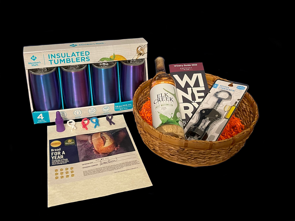 This fun duo includes the following items: 1 Bottle of Elk Creek Winery Sweet Watermelon 4 Insulated Tumblers 1 Corkscrew 4 Silicone Wine Glass Identifiers 1 Silicone Wine Stopper 1 Year of Panera Bread - 1 Free Loaf of Bread Every Month for 12 Months