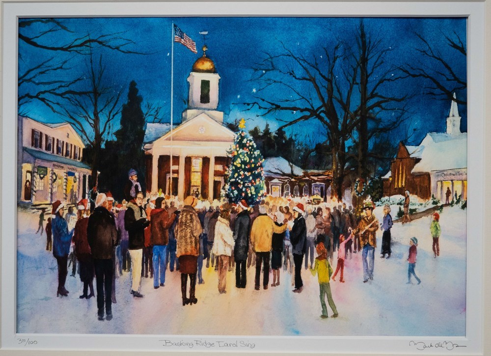 "Basking Ridge Carol Sing" by Mark deMos beautifully captures the spirit of community during the holiday season. This fine art giclee print is signed and is number 35/100 of a limited production. The print with mat measures 20" x 16".