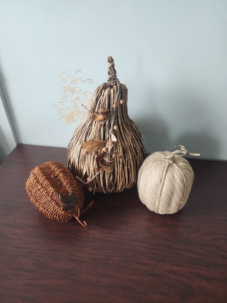 Wicker Pumpkin, Macramé Pumpkin, and Straw Gourd