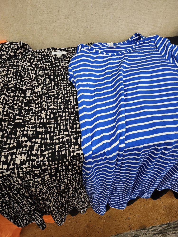 Short-sleeved blue and white horizontal striped dress with pockets, size XL and black and tan short sleeve dress, Suze 16.