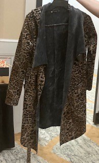 knee length jacket with belt, pockets and hood. Has fur like lining. Size L, but runs small, sized like a M.