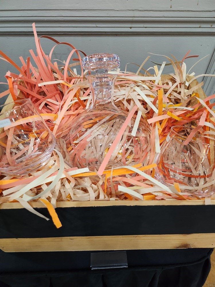 Glass decanter and two glasses.