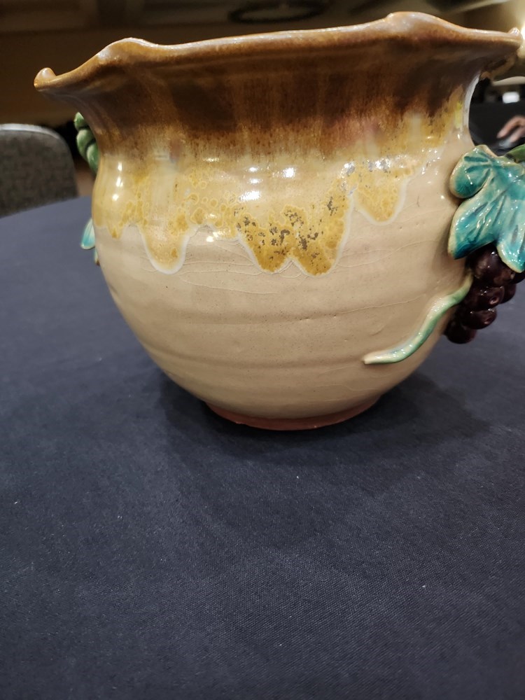 Decorative ceramic bowl embellished with grape clusters as handles.