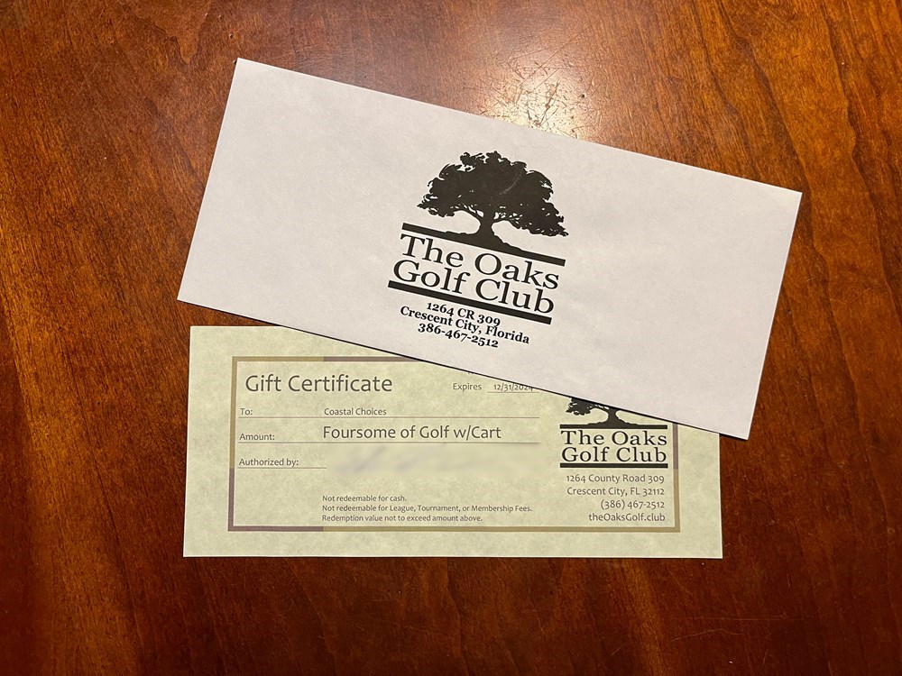 Foursome of golf INCLUDING cart at the beautiful Oaks Golf Club in nearby Crescent City! The Oaks Golf Club has a PGA teaching pro on-site, restaurant, driving range, and practice green. The front nine holes of the golf course offer wide fairways, with medium size greens; while the back nine requires more accuracy off the tees with larger contoured greens. This variety from the back to front presents a different, challenging, and yet enjoyable golfing experience each time you play. There are no sand traps on the course, but there are several ponds and water hazards (and an occasional alligator or two). The course also offers a putting green, driving range, and range balls for your practice needs. After your round, join us in the The Oaks Golf Club Restaurant and choose from a variety of fantastic burgers, wings, salads, sandwiches, and other terrific homemade selections. Details: Greens fees and Cart fee included for up to 4 players. Restrictions: Certificate expires 12/31/2024. Book tee time in advance by calling 386-467-2512.