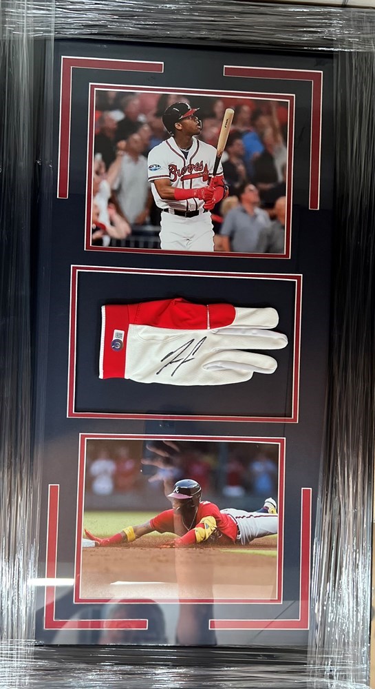 Professionally framed signed batting glove of Ronald Acuna Jr