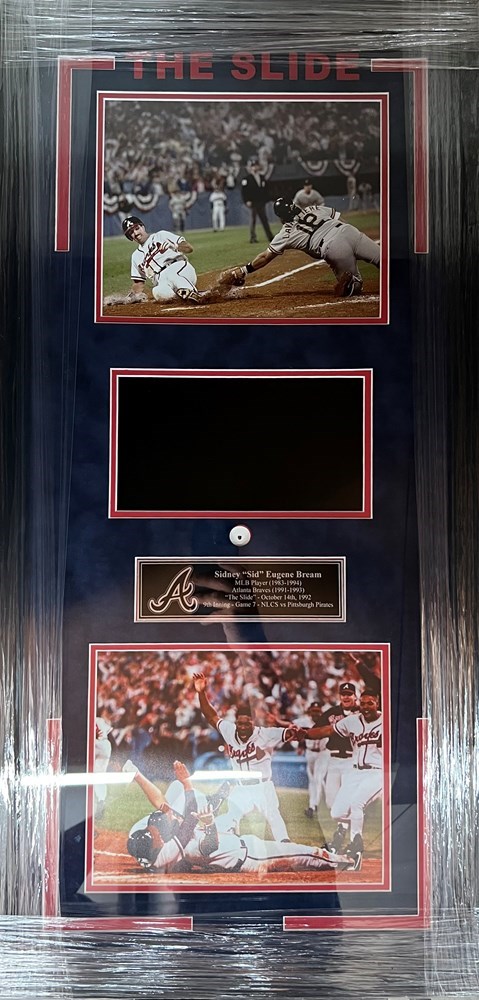 Take a look at this amazing new revolution in sports memorabilia including a video panel within a frame This piece commemorates one of the most famous moments in Atlanta Braves history in the 1992 NLCS when Sid Bream scored in the bottom of the 9th inning to send the Braves back to the World Series