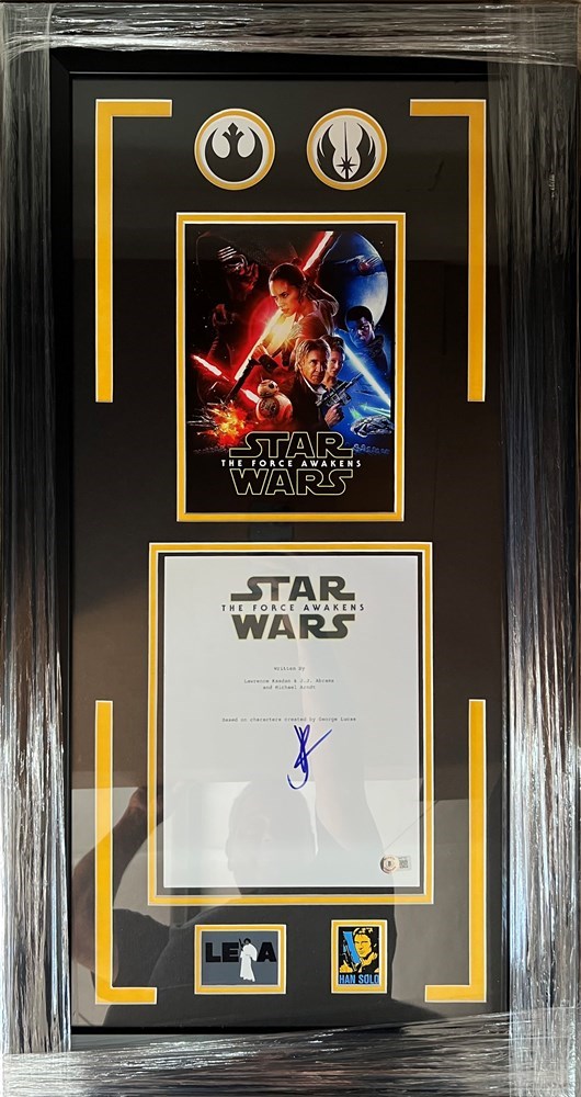 This collage commemorates the re awakening of the Star Wars movie franchise under director JJ Abrams who Directed this move - “The Force Awakens” The script is personally signed and authenticated by JJ Abrams