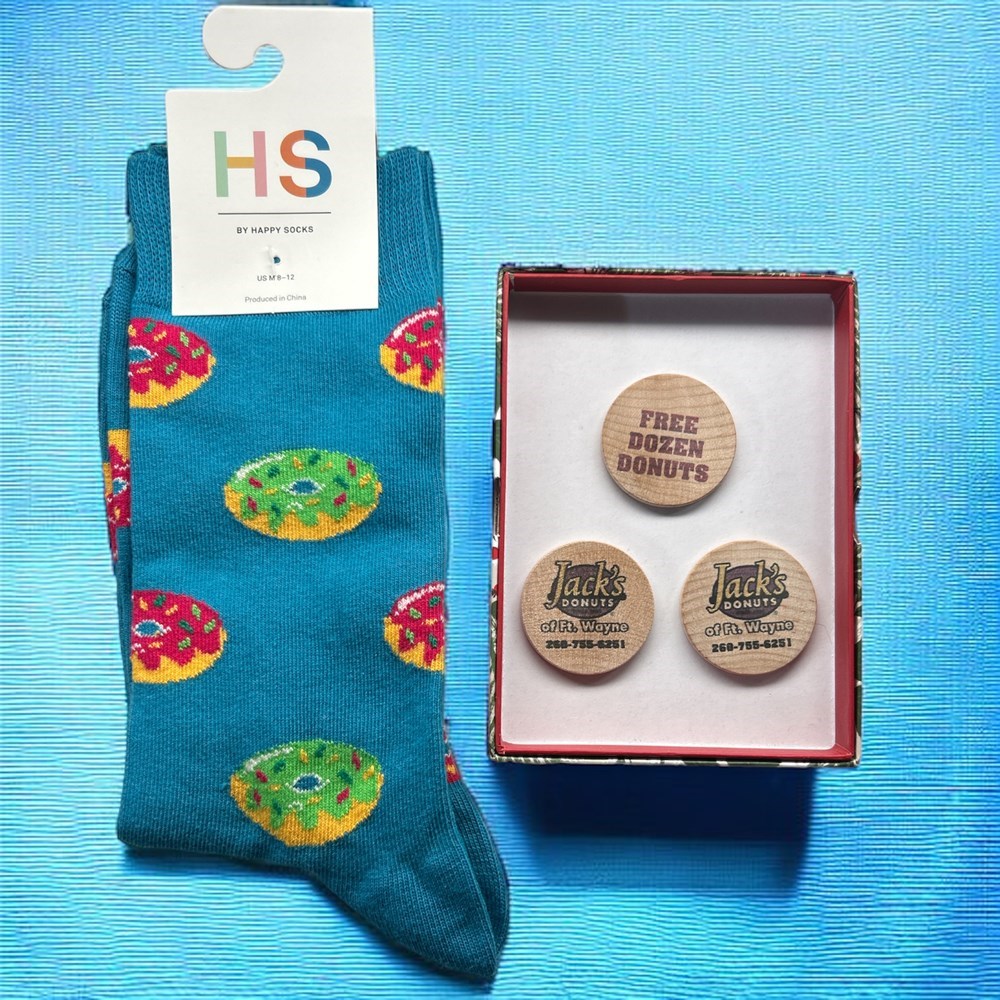 This package includes a cute pair of donut socks and three donut tokens. Each token is good for a free dozen of donuts at Jack’s Donuts in Fort Wayne. PLEASE NOTE: IF YOU LIVE IN FORT WAYNE OR NEARBY AND WOULD LIKE TO PICK UP YOUR ITEM FROM ME, PLEASE OPT OUT OF THE SHIPPING FEE, BY USING THE OPT OUT BUTTON.