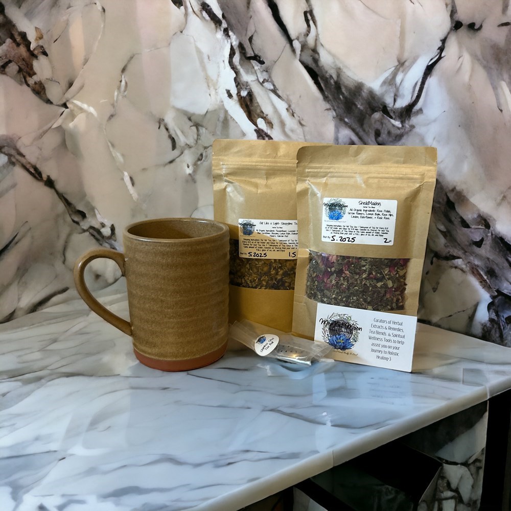 This bundle contains: 1-earthy mug 1-stainless steel tea ball 1-bag of Out like a light sleepy time tea (herbal tea blend) All organic ingredients. 1-bag of SheildMaiden (herbal tea blend) All organic ingredients Each bag has the exact ingredients listed with instructions. Both bags expire 5/2025 PLEASE NOTE: IF YOU LIVE IN FORT WAYNE OR NEARBY AND WOULD LIKE TO PICK UP YOUR ITEM FROM ME, PLEASE OPT OUT OF THE SHIPPING FEE, BY USING THE OPT OUT BUTTON.