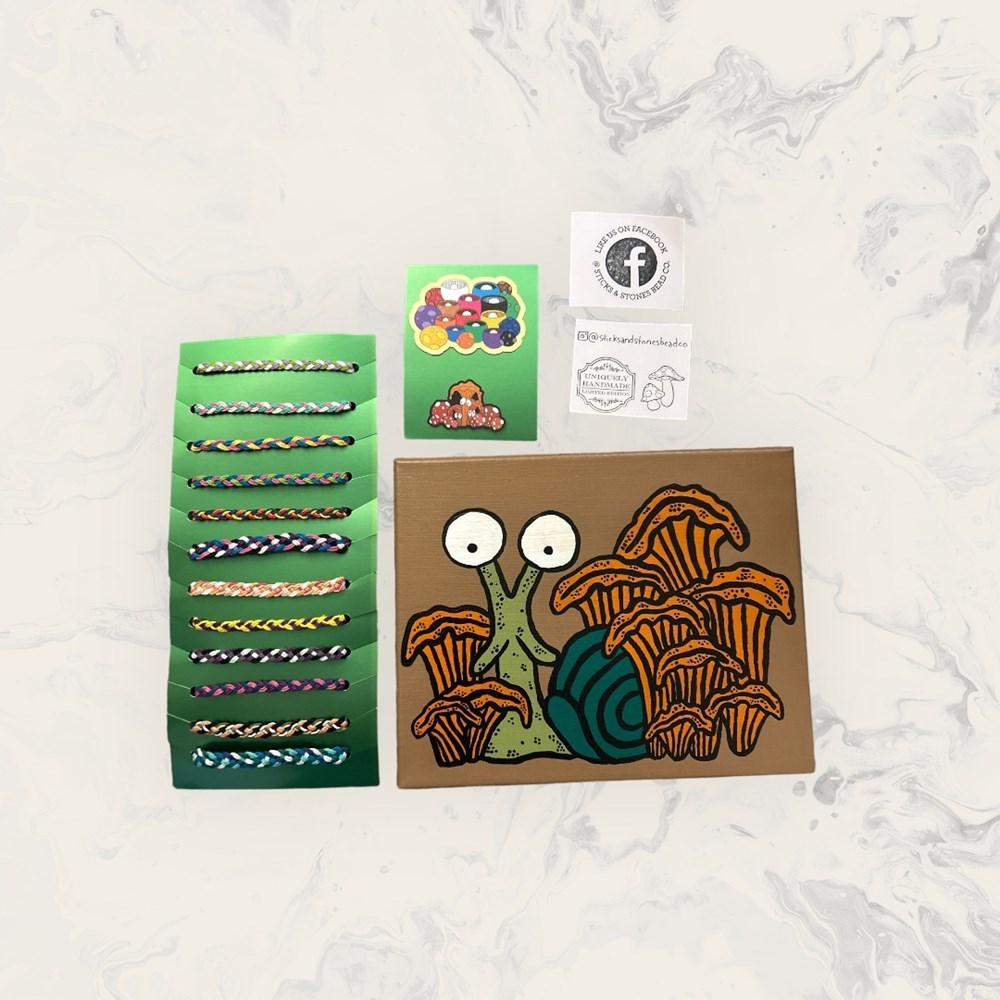 Box contains: -8+10 cotton canvas art 'Dead Mushroom -Collection' -12 braided bracelets -2 stickers Value $150+ PLEASE NOTE: IF YOU LIVE IN FORT WAYNE OR NEARBY AND WOULD LIKE TO PICK UP YOUR ITEM FROM ME, PLEASE OPT OUT OF THE SHIPPING FEE, BY USING THE OPT OUT BUTTON.