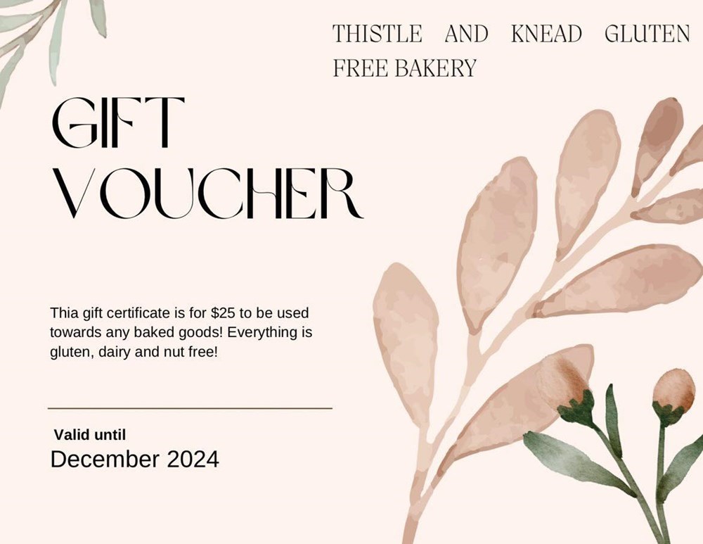Thistle & Knead is a Gluten-free bakery. This voucher is for $25 to be used for any baked goods. PLEASE NOTE: IF YOU LIVE IN FORT WAYNE OR NEARBY AND WOULD LIKE TO PICK UP YOUR ITEM FROM ME, PLEASE OPT OUT OF THE SHIPPING FEE, BY USING THE OPT OUT BUTTON.