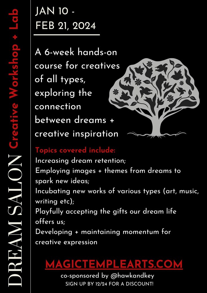 The Dream Salon Workshop is donated by Magic Temple Arts This is a 6-week enrollment in an online creative workshop running January 10-February 21, 2024. Magic Temple Arts is pleased to offer our online Dream Salon Creative Lab and Workshop to start 2024! This 6-week course, inspired by and developed for creatives of all types, explores ways to use sleeping dreams to fuel our creative works in waking life. Enrollment includes 6 online weekly sessions (1.25 hrs each); a Dream Lab Workbook with self-assessments, exercises, prompts, and resources; and a private forum to share your creations, questions, and reflections with others during the course. The Dream Salon Lab and Workshop is a supportive course, open to those actively interested in developing ideas they are currently experimenting with, igniting new ones, and engaging with the content their psyche is providing during dream and daydream times. Creatives of all types are welcome — artists, musicians, writers, crafters, coders, inventors, filmmakers, actors, game-makers, and any seeking to grow their works. Runs 01/10/24-02/21/24. https://magictemplearts.com/welcome-to-the-dream-salon-2024/