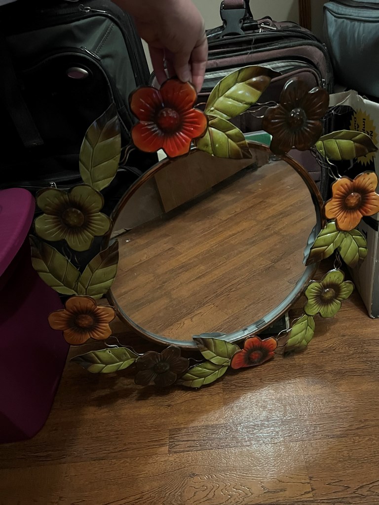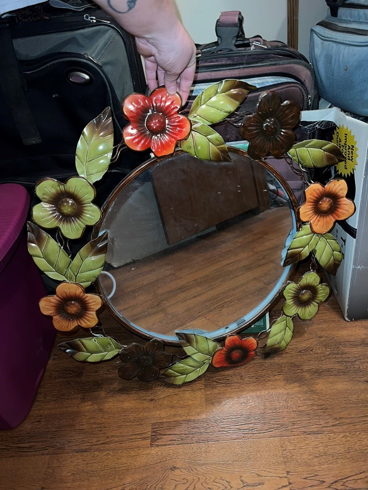 ROUND METAL FLORAL MIRROR ***Local Pickup In Dayton Only*** Storage unit clean out. There will be new and used items. All items may show signs of dust or have a musty odor from being in storage for many years and will need to be cleaned! Everything is sold as-is. We do our best to point out imperfections but please look closely at pictures. If you have any questions or concerns, please message us before bidding. ***LOCAL PICKUP ONLY*** Pickup options will be available Monday through Friday. Times and address to pick up will be sent to the winning bidders. Thank you in advance:)